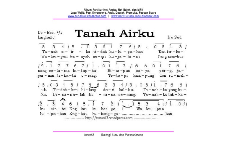 Not Angka Dan Not Balok Lagu Tanah Airku. Lagu tanah airku sendiri merupakan lagu wajib nasional yang sangat terkenal dan banyak digandrungi serta dinyanyikan oleh masyarakat indonesia. Walaupun banyak negri kujalani yang masyhur permai dikata orang tetapi kampung dan rumahku di sanalah kurasa senang tanahku tak kulupakan. Berikut lagu tanah airku karya ibu sud yang siap diunduh, partitur dalam not angka dan not balok.
