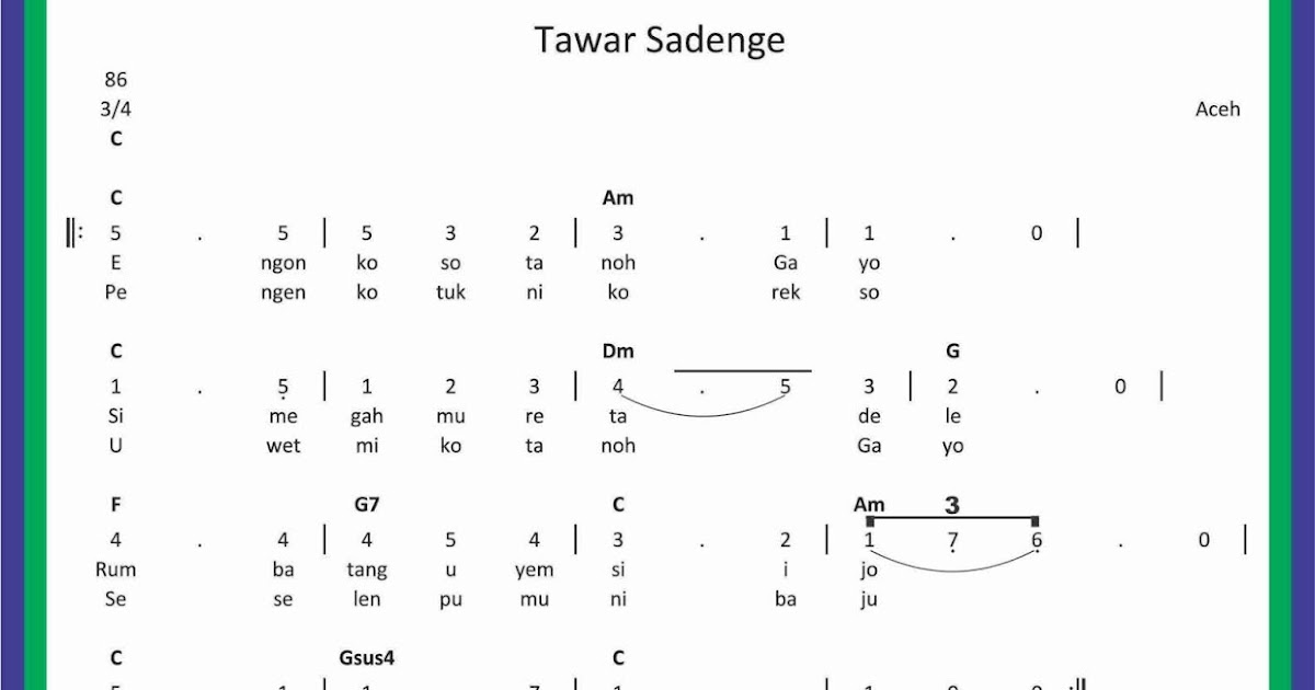 Not Angka Lagu Daerah Aceh. Indonesia mempunyai 34 provisinsi terdiri dari wilayah sabang sampai marauke, sehingga mempunyai banyak not angka lagu daerah yang bisa dipelajari. Tutorial piano level 1 dilengkapi dengan notasi balok dengan sistem doremi. Bingung cari not angka lagu untuk lagu wajib nasional?.