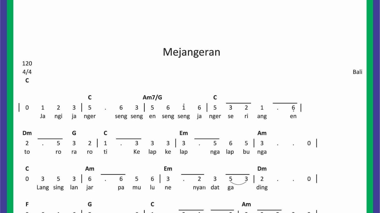 Not Angka Lagu Daerah Bali. Kumpulan not angka lagu lagu indonesia maupun luar negri. Not balok dan not angka lagu merupakan hal yang sangat sering dicari oleh para pemain musik. Lirik lagu daerah ini kami lengkapi dengan terjemahan lagu dalam bahasa indonesia yang dapat memudahkan kalian dalam memahami arti lagu apuse.