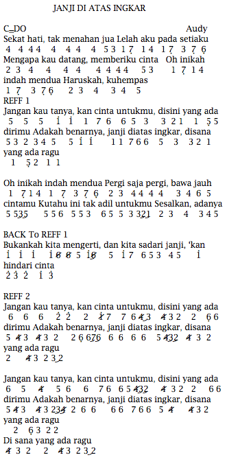 Not Angka Lagu Korban Janji. Menyajikan not angka lagu pianika, not angka lagu piano, not angka lagu suling, not angka lagu gitar, not angka lagu recorder, dan lirik lagu. Not angka bondan ft 2 black tetap semangat. Not angka pianika lagu ikon love scenario.