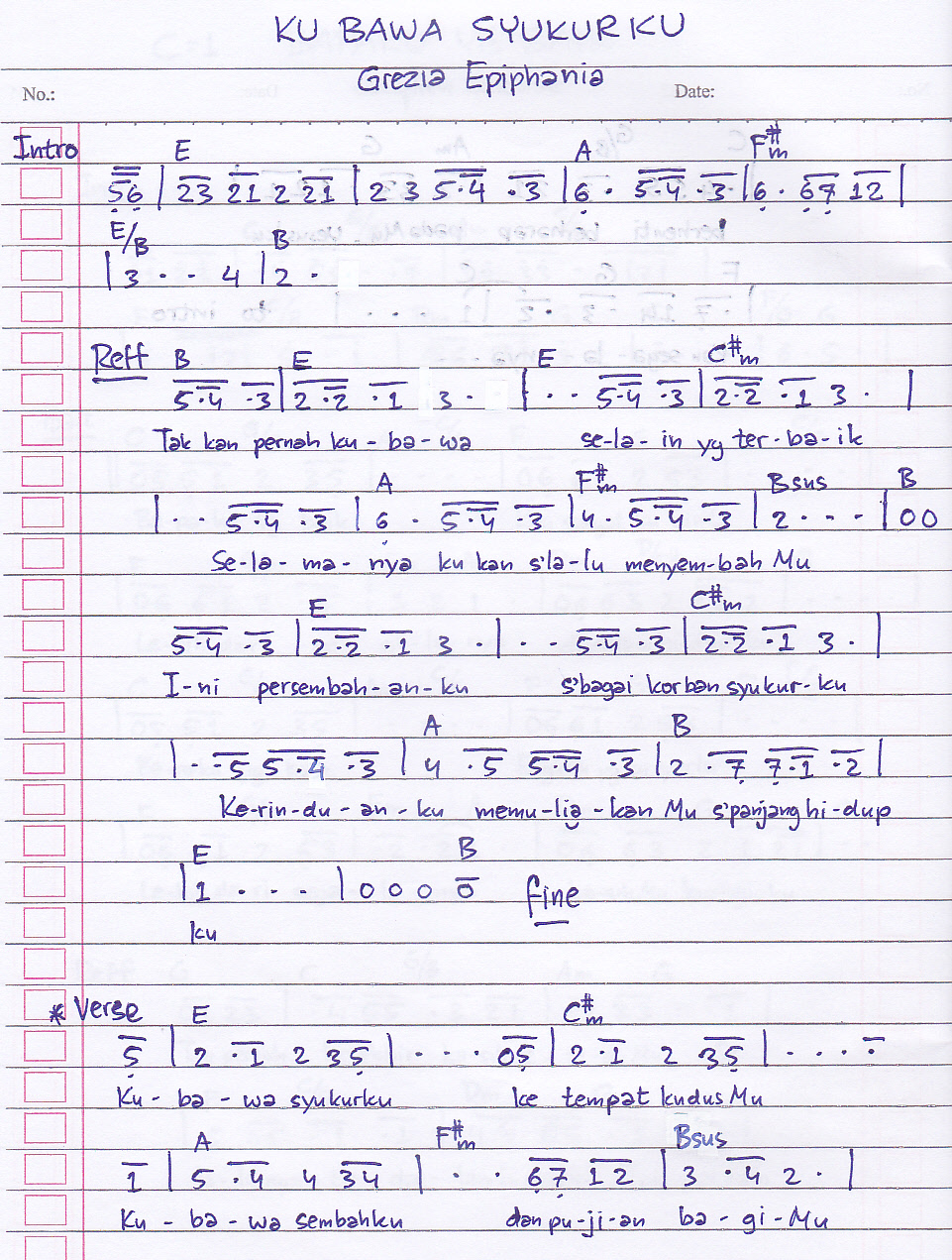 Kubawa korban syukur ke tempat kudusmu tuhan hatiku limpah dengan syukur s'bab tuhan baik selamanya s'bab tuhan baik. Kalian bisa simpan not angka ini di device atau gadget kalian sehingga dapat dengan mudah membukanya kembali ketika latihan menyanyikan ataupun instrumentasi lagu. Saat kumasuk ke hadiratmu kutersungkur dan sembahmu kupersembahkan korban syukurku yang terbaik bagimu. Are you see now top 10 kubawa syukurku results on the web. Saat ku masuk ke hadiratmu kutersungkur dan sembahmu kupersembahkan korban syukurku yang terbaik bagimu. D g saat ku masuk ke hadiratmu em a d kutersungkur dan sembahmu d g kupersembahkan korban syukurku em a d a yang terbaik bagimu. Chord kubawa korban syukur (nikita). Kubawa syukurku lagu mp3 download from mp3 ssx. Pilih satu dari daftar dibawah sesuai dengan yang anda cari.