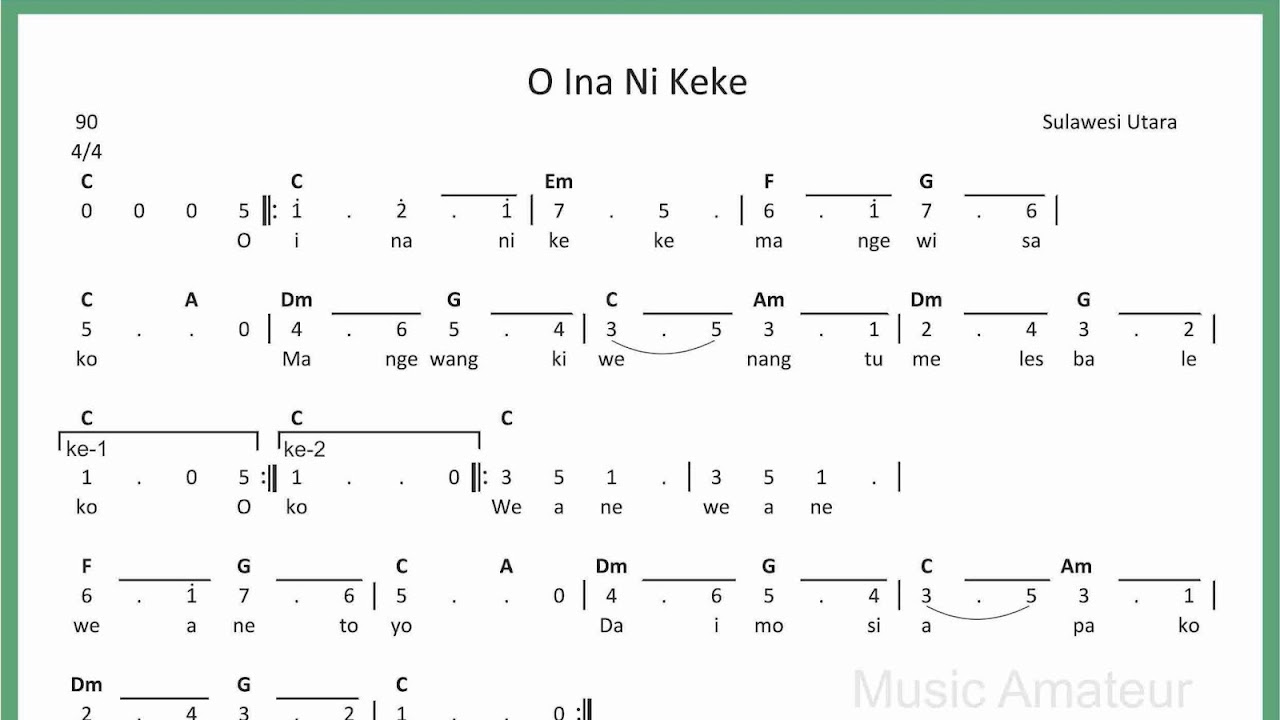 Berikut lagu o ina ni keke dalam partitur not angka dan not balok serta dilengkapi dengan akord/kunci gitar. Not angka o ina ni keke kumpulan not angka lagu. Not balok dan not angka lagu merupakan hal yang sangat sering dicari oleh para pemain musik. Download lagu terbaru, gudang lagu mp3 gratis terbaik 2020. Informasi lagu o ina ni keke. Arti lagu o ina ni keke: Lagu ini dinyanyikan oleh artis bernama various artists yang dibuat pada tahun 2003 dengan judul album lagu daerah anak anak nusantara. Lagu nusantara daerah sulawesi utara. Daftar isi1 daftar not angka lagu wajib nasional1.1 not angka indonesia raya1.2 not angka mengheningkan cipta1.3 not angka tanah airku1.4 not pianika hymne guru1.5 not angka gurur bunga1.6 not angka suwe ora jamu1.7 not.