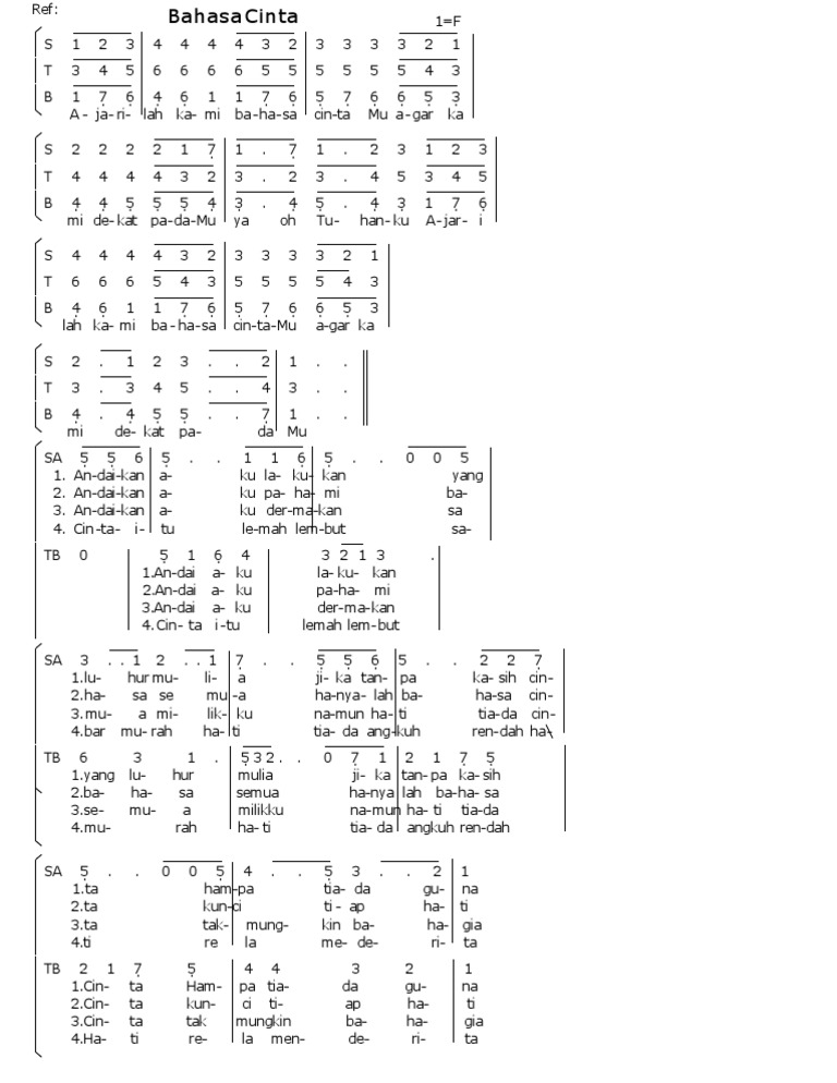 Not Angka Lagu Rohani Bahasa Cinta. Selain itu, lagu ini juga menggambarkan bahwa setiap masyarakat berani untuk melindungi kesejahteraan indonesia dengan menggunakan ideologi pancasila. Tanpa chord pengiring music dan juga not balok. Baru pada tahun 2014 lalu, penyanyi wanita energik tersebut dikenal oleh masyarakat.