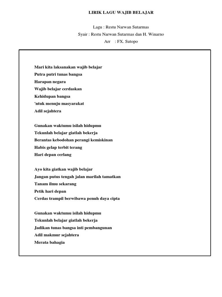 Not Angka Lagu Wajib Belajar Lagu wajib atau lagu nasional wajib dan harus diketahui oleh seluruh warga negara indonesia.