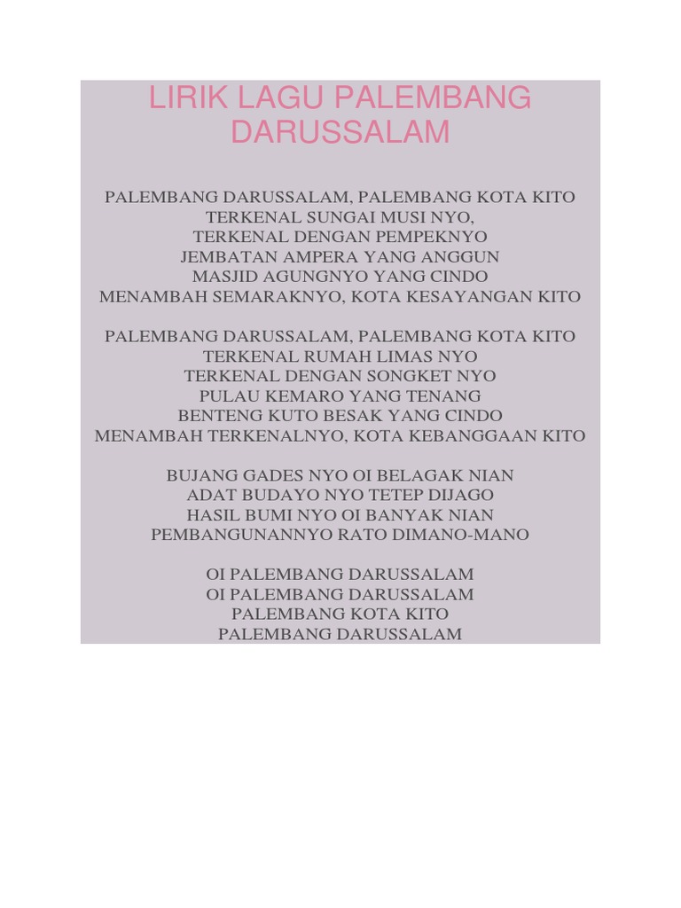 Darussalam palembang darussalam, palembang kota kito terkenal sungai musi nyo, terkenal dengan pempeknyo jembatan ampera yang anggun masjid agungnyo yang cindo menambah semaraknyo, kota. Download lagu terbaru, gudang lagu mp3 gratis terbaik 2020. Palembang darussalam palembang kota kito palembang darussalam. Use the citation below to add these lyrics to your bibliography: Penerimaan mahasiswa baru politeknik darussalam palembang. Sebelum kerajaan palembang (palembang lama) berdiri, kota palembang sudah ada terlebih dahulu sebagai salah suatu wilayah kekuasaan majapahit pada saat itu.