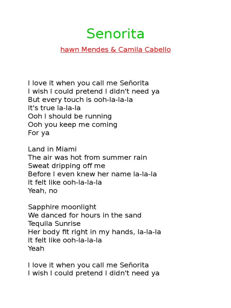 Not Lagu Senorita. Download lagu senorita mp3 gratis, download mp3 senorita, download musik senorita, download. Download lagu senorita mp3 gratis. Lirik lagu 'señorita' shawn mendes & camila cabello, lengkap dengan terjemahan i love it when you call me señorita i wish i could pretend i didn't need ya but every touch is oh la la la it's true la la.